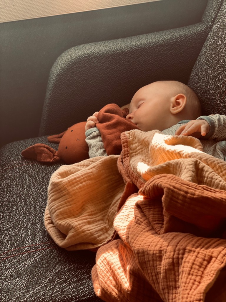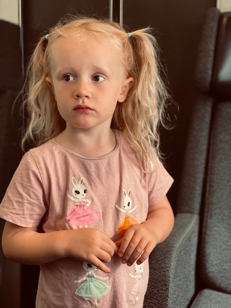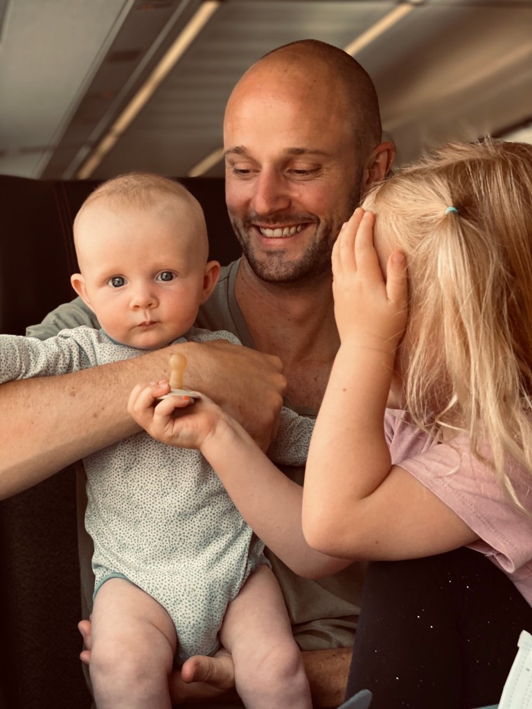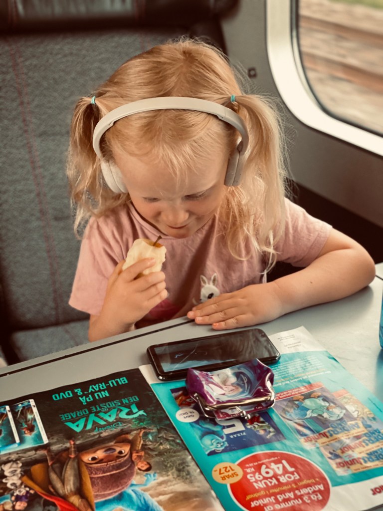 Vores ældste pige på 4 år er vandt til togtransport, da vi ofte tager turen København – Aalborg. Vores yngste pige på 6 måneder er for det meste glad, hvis bare hun kan sidde på os, gumle i et stykke legetøj og få sig en lur i ny og næ.