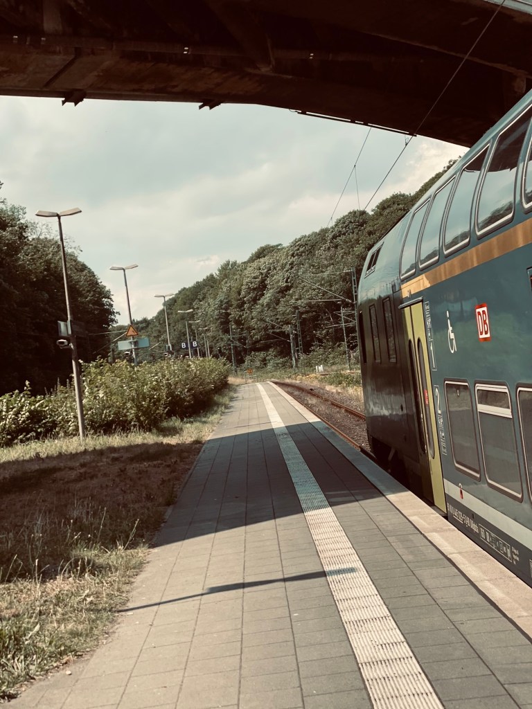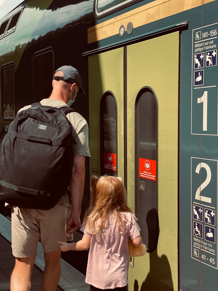 Det var lidt spændende hvilke slags tog, og ikke mindst hvilke siddepladser vi kunne få fra Flensborg til Hamborg – og hvad med barnevognen? Men det viste sig at være helt OK. Jeg sad nedenunder (et dobbeltdækker tog) med barnevognen med Adda i, der hvor cyklerne står, og min kæreste Anders og vores ældste pige sad ovenpå.