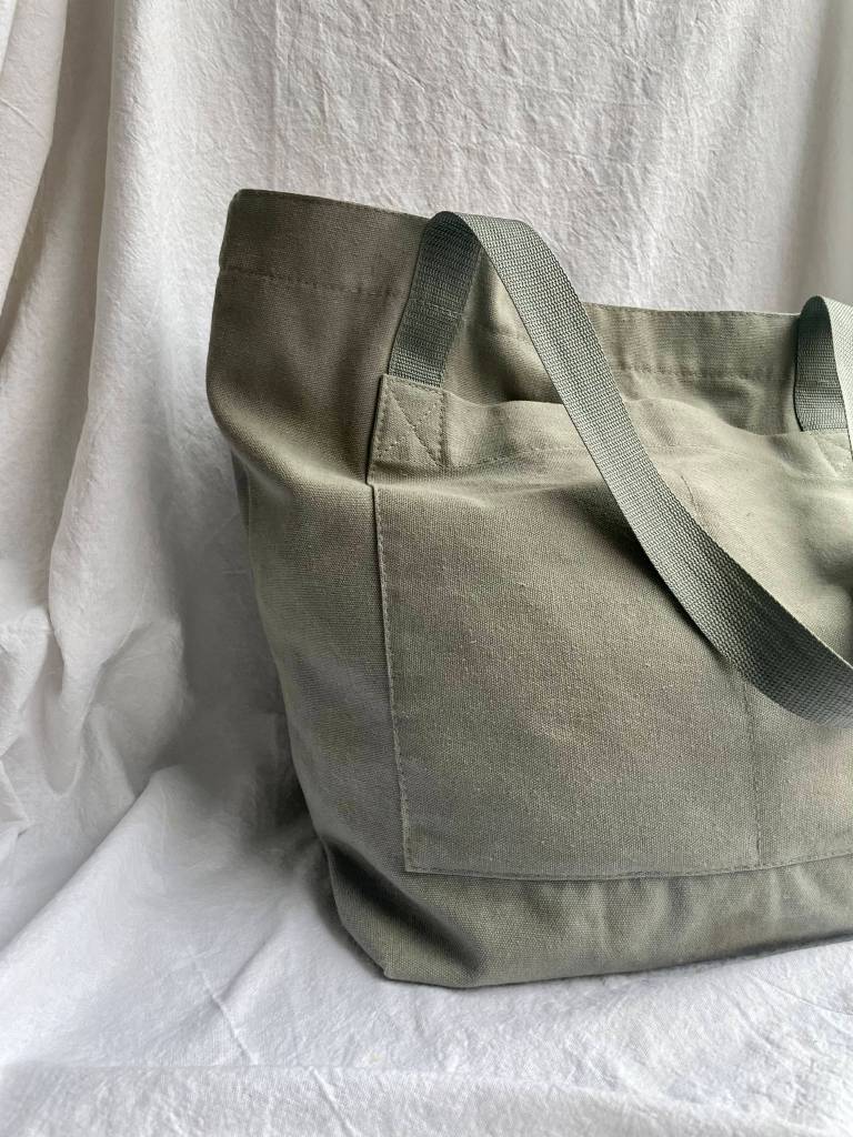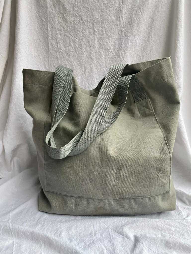 The soft green tote bag, is a weekend bag. Will easily fit as a cabin bag, as it is very spacious but will not take much attention.